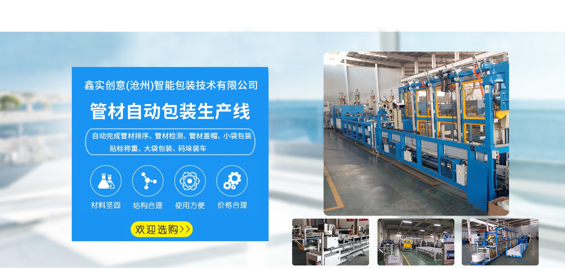 自主研發產品有食品行業:食品包裝機、散包高速理料機、食品高速理料生產線、全自動管材包裝生產線、管材包裝設備、自動折盒機、高速裝盒機、高速投包機、高速散包自動上料機、高速包裝機移動式端封、立式枕式自動接膜機、包裝設備自動糾偏儀、打孔器、真空自動上料機、視覺檢測等多種自動化設;建材行業:直管包裝生產線、蓋帽機、飛行檢測儀等;公司業務范圍涵蓋建材、食品、醫療多個行業,客戶遍及上海、天津、浙江、江蘇、山東、河南、四川、廣西等地。